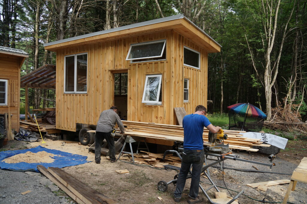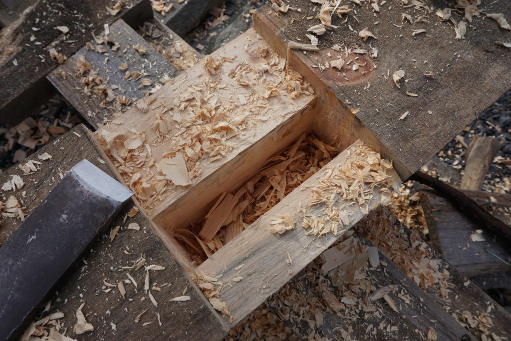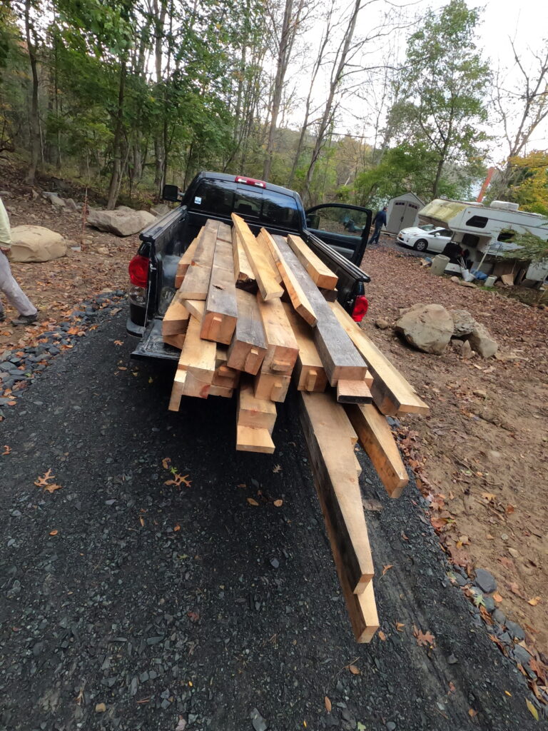 A timber frame of white and red oak, ash, cherry, maple and pine.