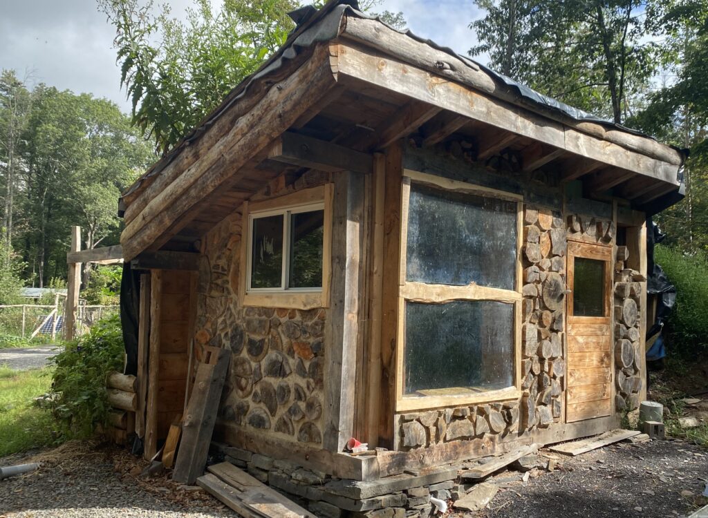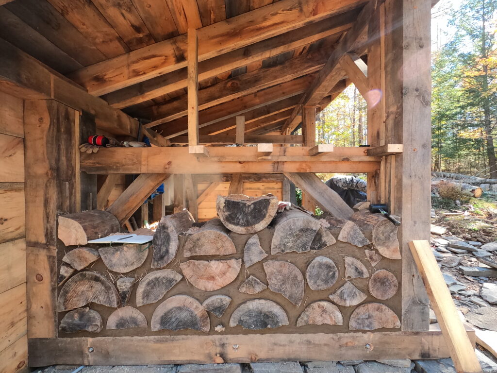 Walls almost done, still needs a roof. Note the overbuilt rafters that will support the heavy load of dirt.